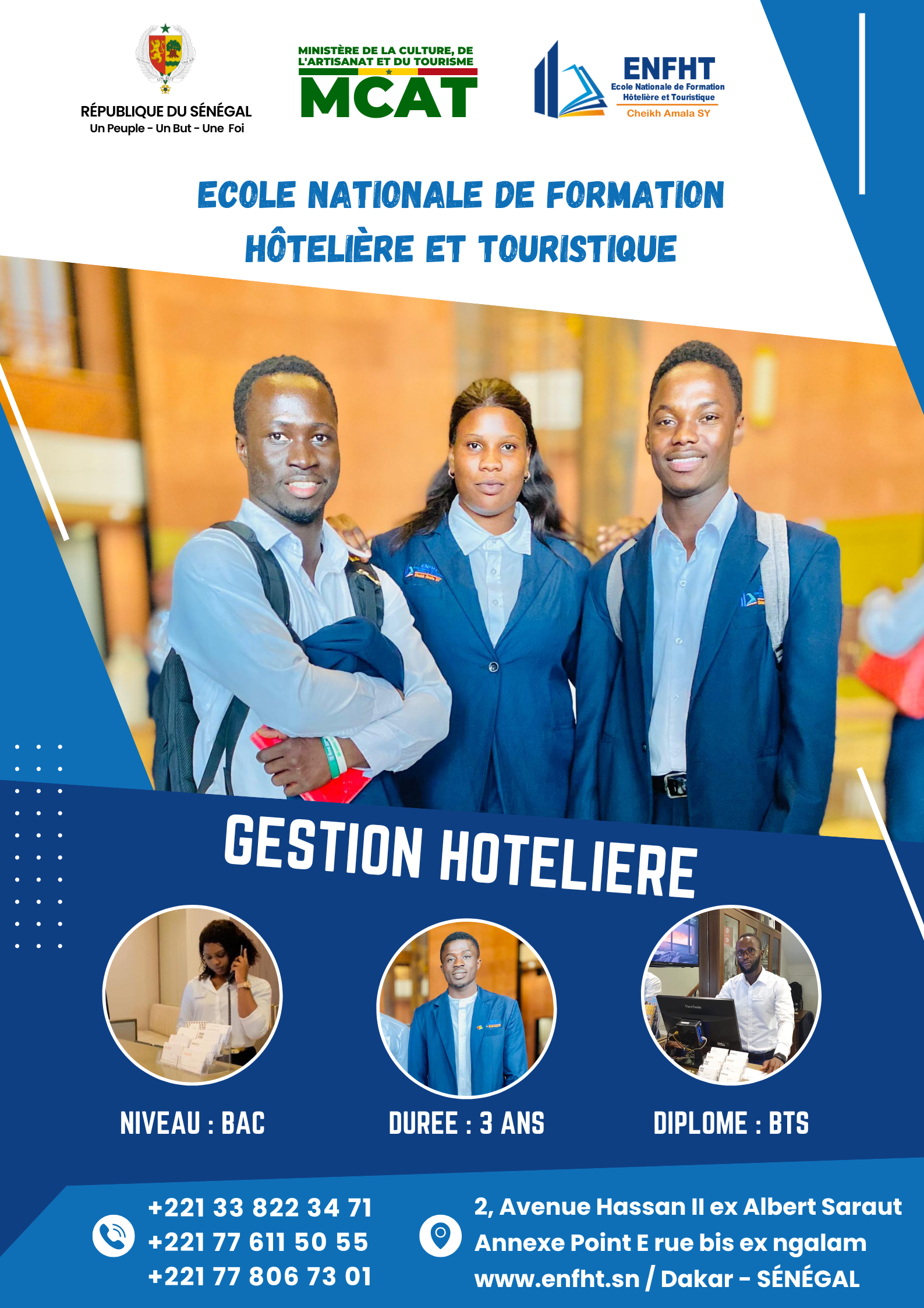 L’Ecole Nationale de Formation Hôtelière et Touristique (ENFHT) accueille des élèves sénégalais sur la base d’un concours national d’entrée et de tests à titre privé. Les étudiants étrangers sont reçus après étude de dossiers. La formation en gestion hôtelière s’adresse aux jeunes titulaires d’un Baccalauréat. Les candidats sont âgés entre 19 et 30 ans pour le concours direct et de 20 à 35 ans pour le concours professionnel. Les concours d’entrée ont lieu aux mois d’avril et mai et les registres d’inscription sont ouverts aux mois de février mars de chaque année. Les tests à titre privé sont ouverts aux mois de septembre et octobre de chaque année.
